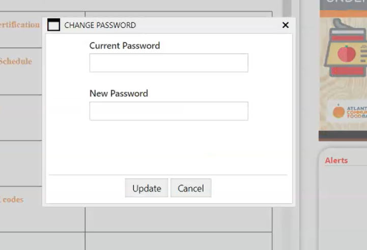 A box should appear that allows you to type in your current password and your desired new password. Once you have filled in these two categories, finalize your updated password by selecting ‘Update’.