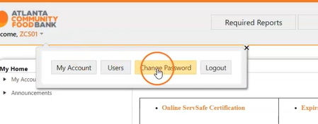 To update or change the password for your eHarvest account, you will need to open the drop-down menu by clicking on the arrow next to ‘Welcome, Account User Name’. From this drop-down menu, you will need to click on ‘Change Password’.