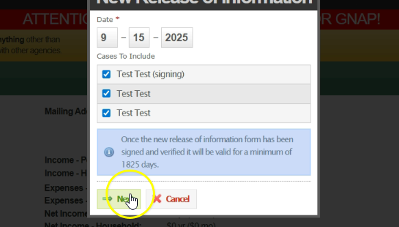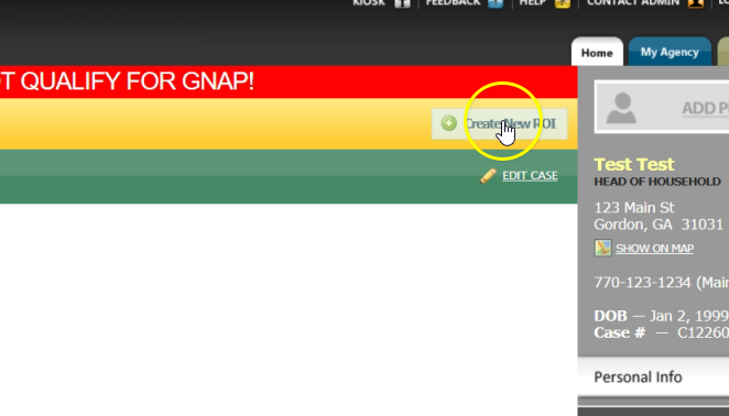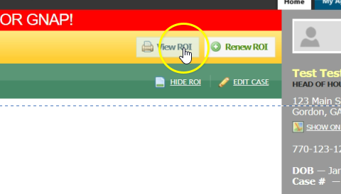 After creating a case, you will see a yellow banner at the top that says a “Release of Information (ROI) is required.” Click “Create New ROI.”
