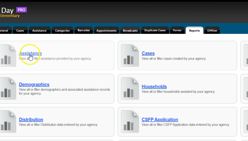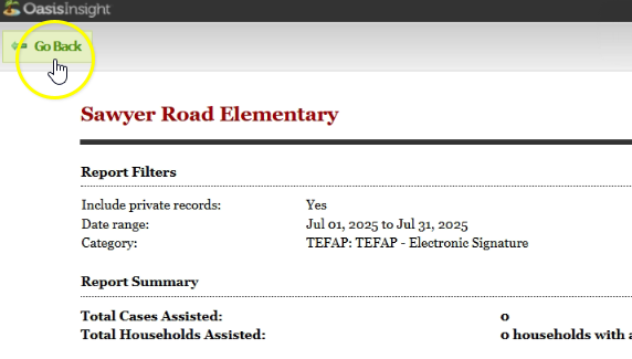 Click “Go Back” in the top left corner of the “Agency Assistance Report.” This will return you back to the “Reports” tab in Oasis.