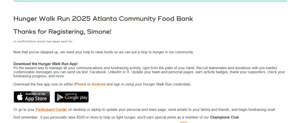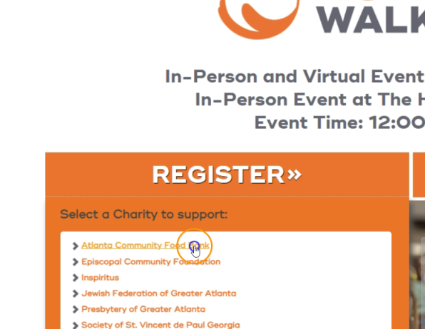 On the homepage of the Hunger Walk Run (HWR) website, begin by hovering over ‘Register’ . Then select Atlanta Community Food Bank from the drop-down menu that appears.