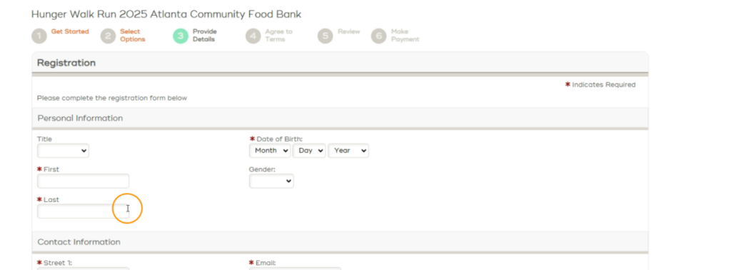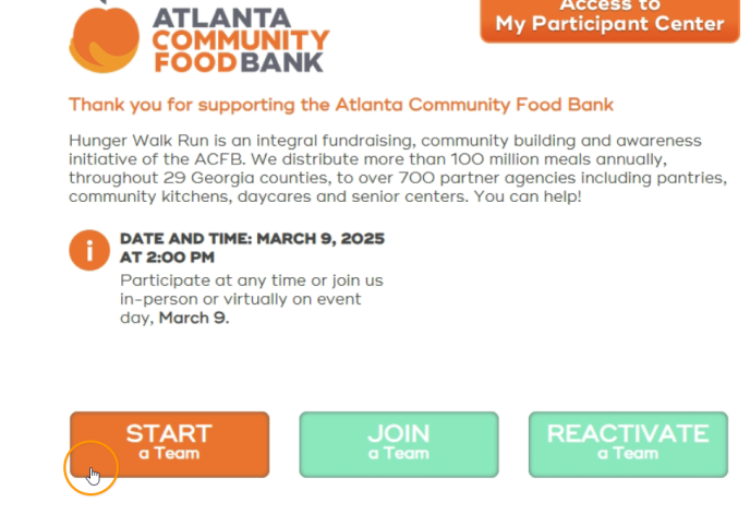 From here, partners are able to either start a team, join a team, or reactivate a team. Partners can reactive teams if they previously participated in Hunger Walk Run.