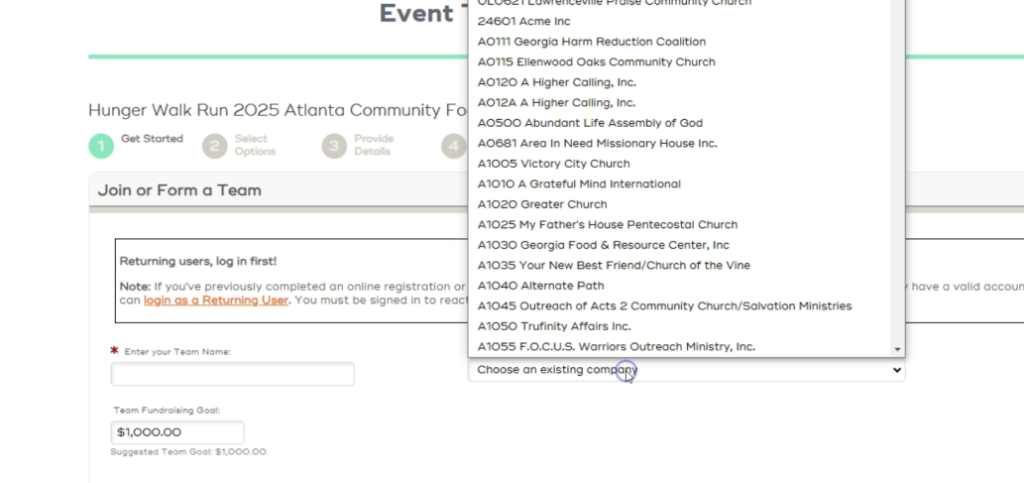 If you are joining or forming a team, use the drop down menu to find your organization by agency code. It will also be important that your remind your supporters to use your agency code when searching for your agency, to ensure that all funds raised go to the correct account.