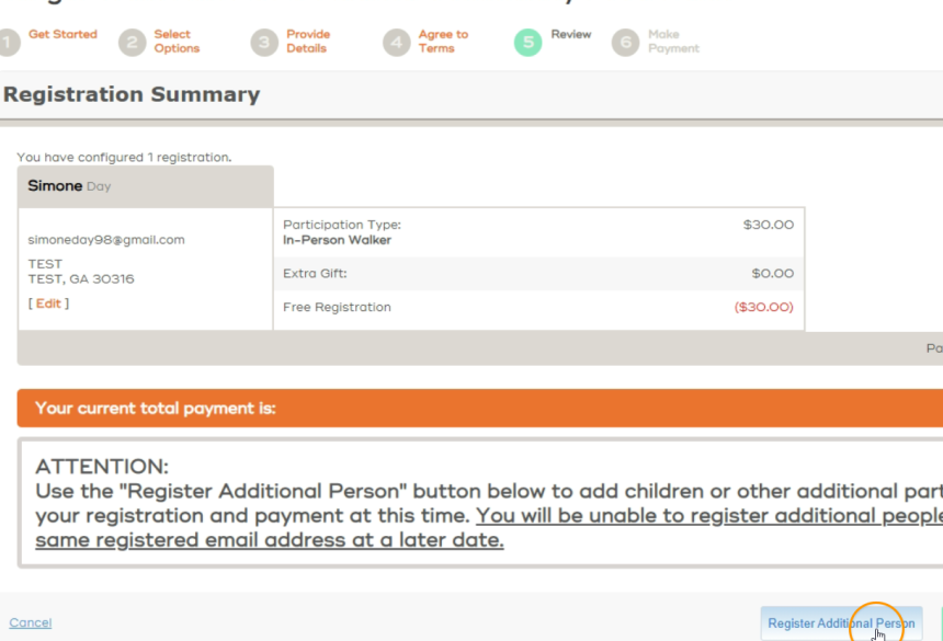 From here you can review your registration before finalizing with payment. If you need to register additional people under the email address you are using for your account please do so at that time.