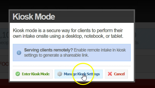When the “Edit Kiosk Settings box” pops up, first select “Enable Remote Intake.” Enter a generic welcome message in the space. We can also create the first message for you, or you may type your own.
