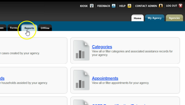 From the Oasis Homepage, click on the “My Agency” tab and then click on the “Reports” tab. From the Reports page, click “Assistance.”