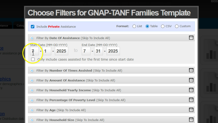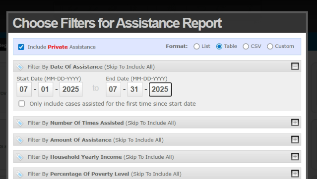 Select “Table” in the top right corner of the dialogue box to choose the format of your report. Click “Filter by Date of Assistance” to enter the date range of your report.