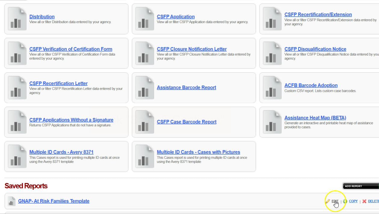 Scroll to the “Saved Reports” Section. Next to your “GNAP – TANF Families Template,” click “Copy.” A second report will appear as the top option, with “Copy” in parenthesis. To the right of the copy, click “Edit.” Change the name of your new report to “GNAP – At Risk Families Template”. Click “Save & Continue.”