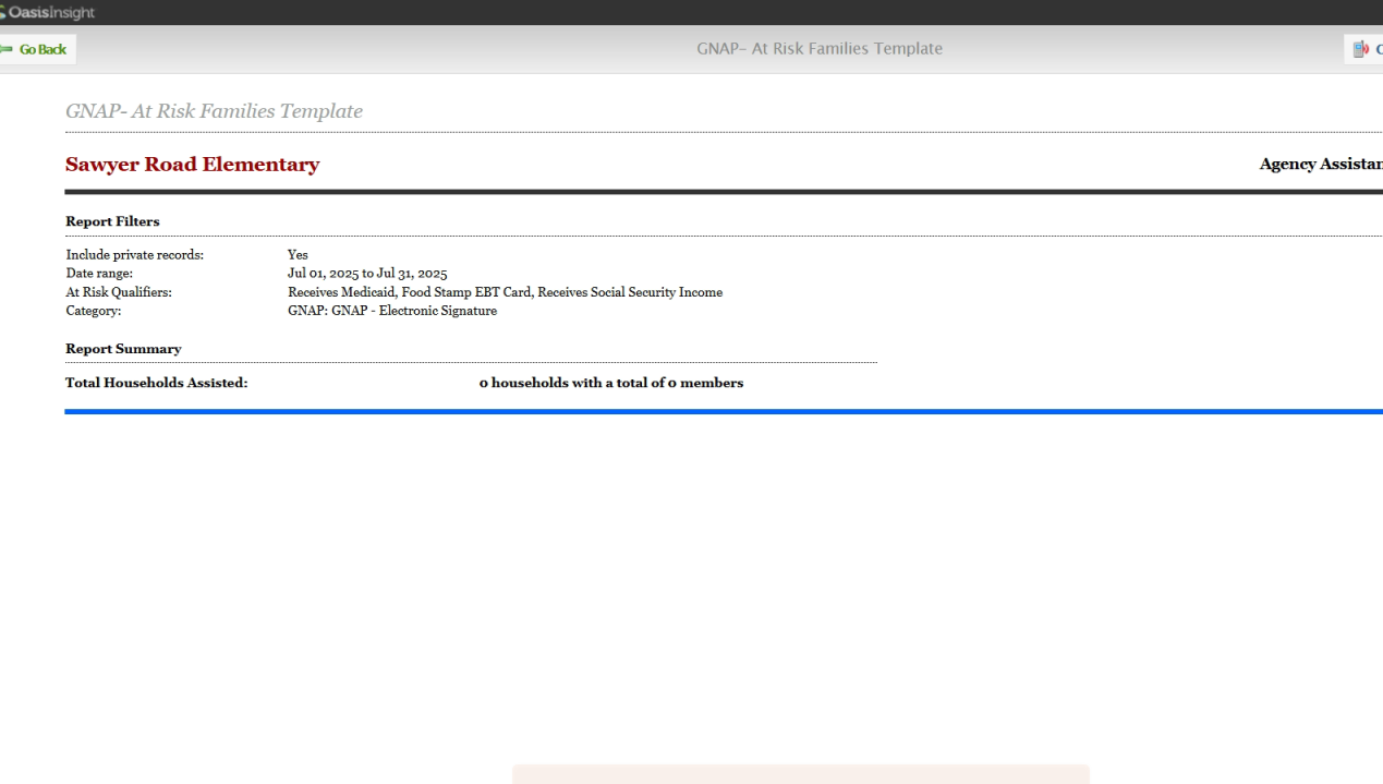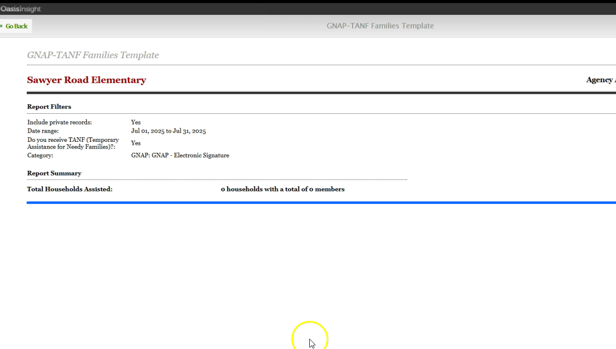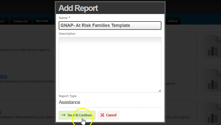 From the Oasis Homepage, scroll down to the “Recent Report” section and click “Add to Saved Reports.” Once added to “Saved Reports,” click “Edit” to the right of the report name. This box will appear. Rename your report “GNAP – TANF Families Template” and then click “Save and Continue.”