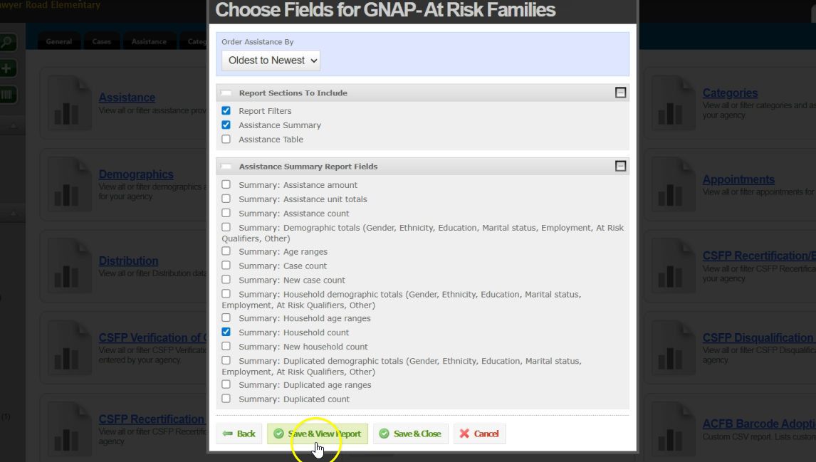 When the next menu appears, click “Save and Continue” again. Do not make any changes to the filters or fields for the report. Click “Save & Close” to finalize your template.