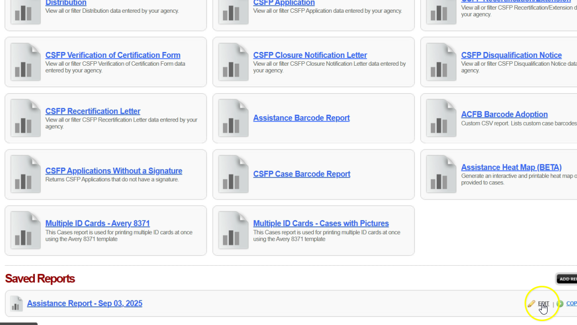Navigate to “My Agency” and then the “Reports” tab on the Oasis Homepage. Scroll down to the “Saved Reports” section. To the right of your report template, click “Edit.”