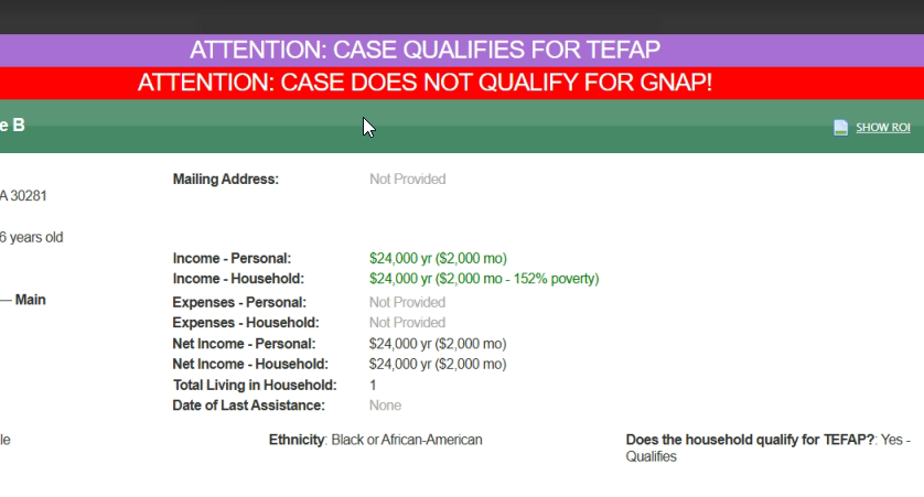 Based on your answer regarding the neighbor’s TEFAP qualification, you will now see a banner on the neighbor’s case indicating whether the neighbor is, or is not, eligible to receive TEFAP food.